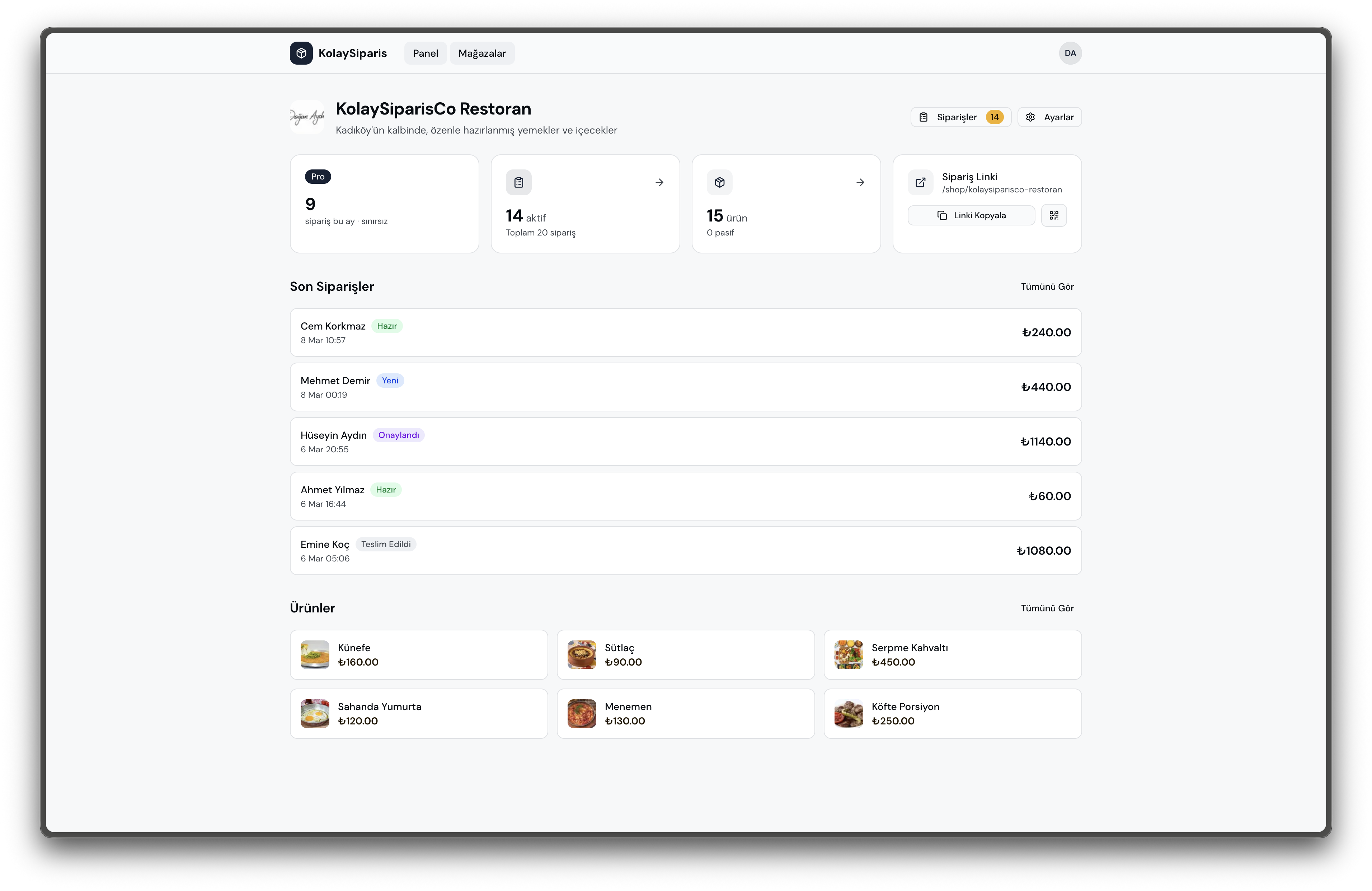 Sipariş listesi, müşteri bilgileri, ürünler ve sipariş durumları — hepsi tek ekranda.
